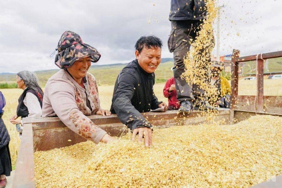 中國西藏網(wǎng)訊 8月29日,四川省甘孜藏族自治州甘孜縣拖壩鄉(xiāng)拖壩四村的500畝青稞基地里,收割機轟鳴作響,飽滿的青稞穗被整齊收割。甘孜縣12萬畝青稞陸續(xù)成熟,高原上一片金黃。據(jù)甘孜縣農(nóng)牧農(nóng)村和科技局數(shù)據(jù)顯示,今年全縣青稞預(yù)計總產(chǎn)量達27805噸,較去年增長4.9%,再創(chuàng)歷史新高。