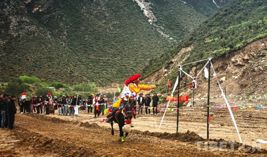 圖為西藏自治區(qū)山南市貢嘎縣昌果鄉(xiāng)普夏村望果節(jié)賽馬會(huì)現(xiàn)場(chǎng),騎手正在參加騎馬射箭比賽 攝影:劉莉