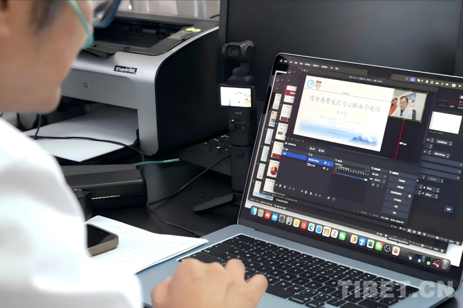 在阿里地區(qū)人民醫(yī)院的行政樓辦公室內(nèi),來自上海華山醫(yī)院神經(jīng)外科、作為第25批“博士服務(wù)團”成員援藏的主治醫(yī)師杜倬嬰,正專注研究一項“新技術(shù)”。桌面上,一臺口袋相機運行著,旁邊電腦屏幕上同步顯示相機所拍攝的畫面,同時呈現(xiàn)的還有一份關(guān)于高原反應(yīng)與心腦血管疾病的課程講義。“這是一套直播系統(tǒng),不過我現(xiàn)在還在學(xué)習(xí)怎么使用?!爆F(xiàn)任阿里地區(qū)人民醫(yī)院黨委委員、副院長的杜倬嬰笑著展示初見雛形的成果。