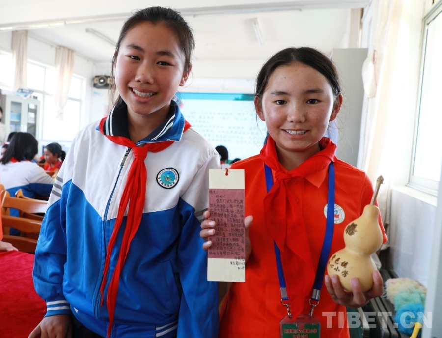 圖為山東聊城堂邑鎮(zhèn)中心小學(xué)的孩子們向西藏阿里噶爾縣孔繁森小學(xué)的小伙伴贈送當(dāng)?shù)靥厣暮J和祝??ㄆC恳粡埧ㄆ隙加泻⒆觽冇H手寫下的最想對遠(yuǎn)方的小伙伴說的祝福語、心里話。攝影:劉莉