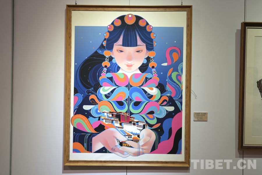 展覽現場,參展藝術家李旻的作品《虹光圣城》色彩絢麗,構思新穎,引得眾多觀眾駐足觀看。據介紹,本幅作品是一副綜合運用了現代藝術創(chuàng)作手段的數字繪畫,同時融入了如布達拉宮、藏裝等經典的藏式元素,畫面生動,色彩鮮艷,形式新穎,展現了當代西藏藝術的傳承與創(chuàng)新,是本次展覽極具代表性的作品之一。