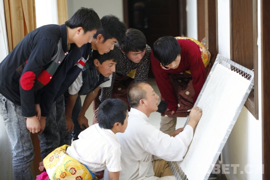 在這次活動(dòng)中,我接觸到了眾多唐卡大師,他們宛如藝術(shù)殿堂中的大師級(jí)工匠,各自散發(fā)著獨(dú)特的光芒。眾多唐卡畫師里面,給我印象深刻的是娘本。為了了解娘本社會(huì)公益和愛心助學(xué)的事情,今年八月份我們?nèi)ニ漠嬙喊菰L。