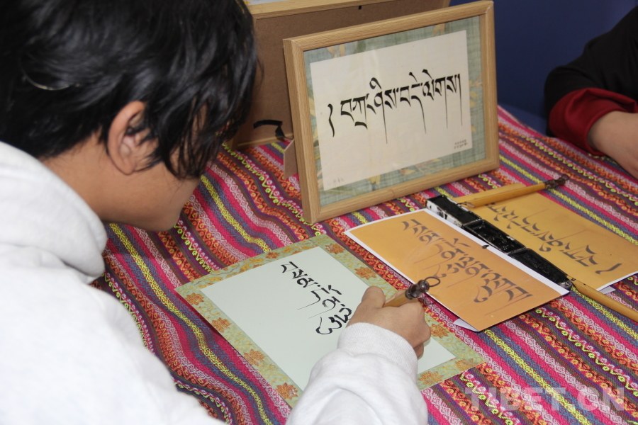 圖為同學(xué)們手拿傳統(tǒng)竹筆學(xué)寫藏文