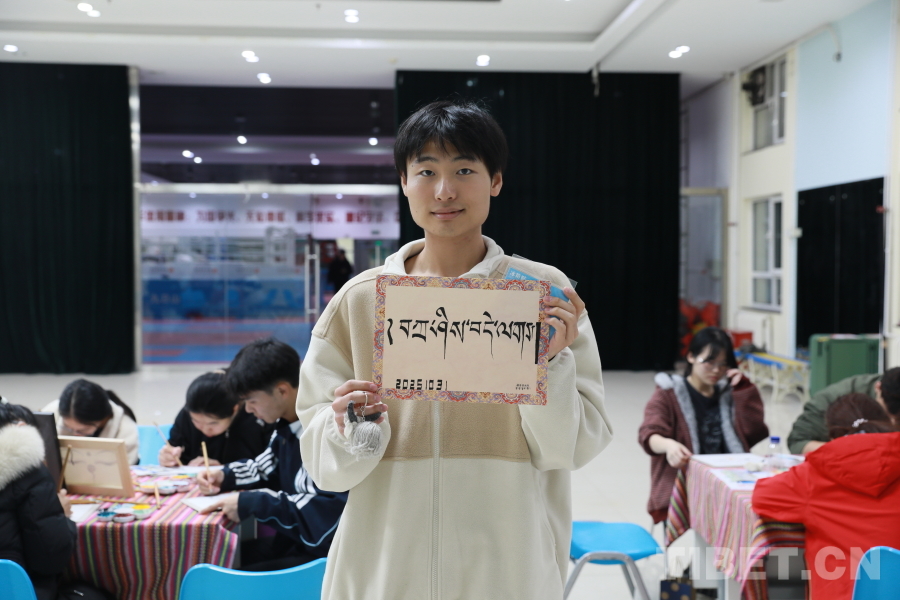 圖為2024級(jí)公共管理專業(yè)的楊乘鶴同學(xué)展示他在藏文書法體驗(yàn)環(huán)節(jié)創(chuàng)作的作品。攝影:畢然