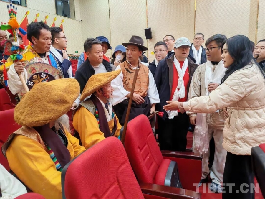 在南木林縣湘巴文化藝術(shù)中心內(nèi),南木林鎮(zhèn)雪藏戲隊的演員們頭戴色彩鮮艷的五彩面具,將經(jīng)典藏戲《智美更登》選段演繹得蕩氣回腸。高亢唱腔極具穿透力,粗獷又滿含張力的舞步踏在舞臺上,每一步都踩出湘巴藏戲的獨特韻味。接著,《格薩爾說唱》的雄渾敘事、《土布加諧慶》的歡快韻律、《扎木念》的悠揚曲調(diào)一一上演,一場非物質(zhì)文化遺產(chǎn)的盛宴令調(diào)研組成員陶醉。他們的手機鏡頭緊緊追隨演員,將精妙的表演、動人的唱腔定格。表演間隙,調(diào)研組的藝術(shù)家們與演員圍坐在一起,圍繞表演技巧展開深入交流,探討唱腔中氣息的綿長運用,研究舞步里節(jié)奏的細微變化。在思想的碰撞中,藏戲藝術(shù)的傳承創(chuàng)新脈絡(luò)愈發(fā)清晰。
