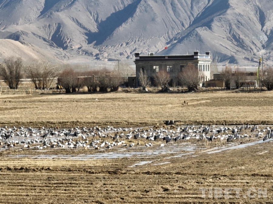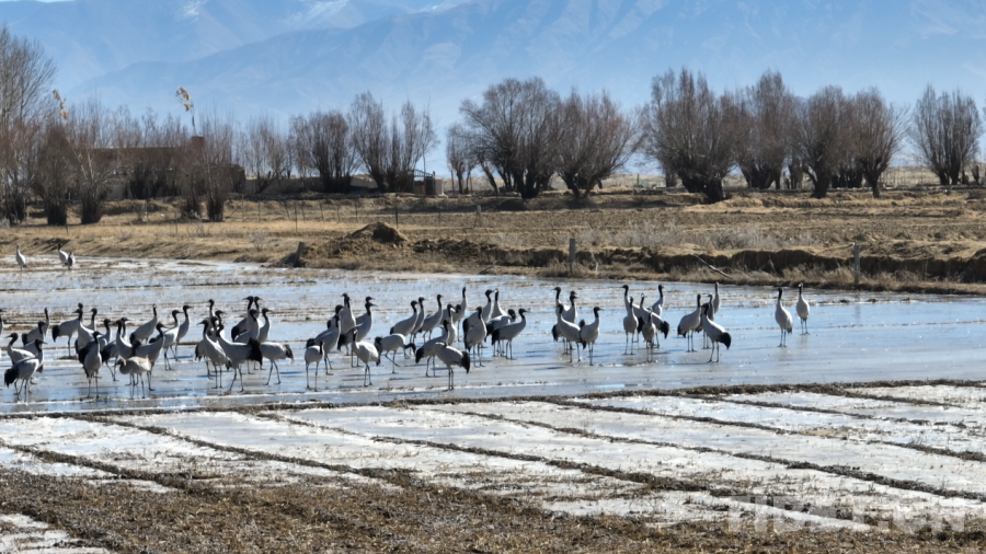 圖為南木林縣艾瑪鄉(xiāng)周邊黑頸鶴在田間集群棲息