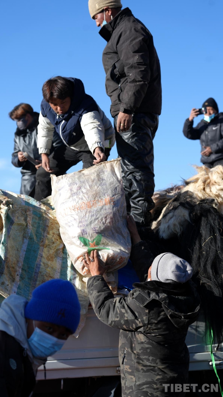 圖為牧民們正忙碌地從貨車上卸下各類畜牧產(chǎn)品