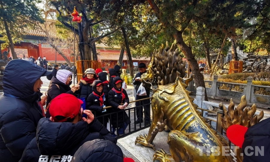 圖為西藏自治區(qū)那曲市色尼區(qū)青少年足球隊赴京研學(xué)團的孩子們在了解故宮里的塑像 攝影:劉莉