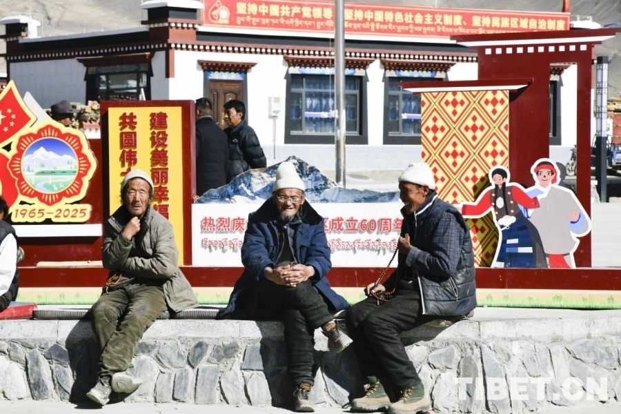 圖為定日縣長(zhǎng)所鄉(xiāng)森嘎村老人在村中廣場(chǎng)沐浴陽光,快樂交談。攝影:趙振宇