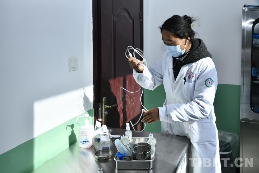 圖為在定日縣長(zhǎng)所鄉(xiāng)森嘎村新修建的村衛(wèi)生室內(nèi),護(hù)士正在做醫(yī)療準(zhǔn)備。攝影:趙振宇