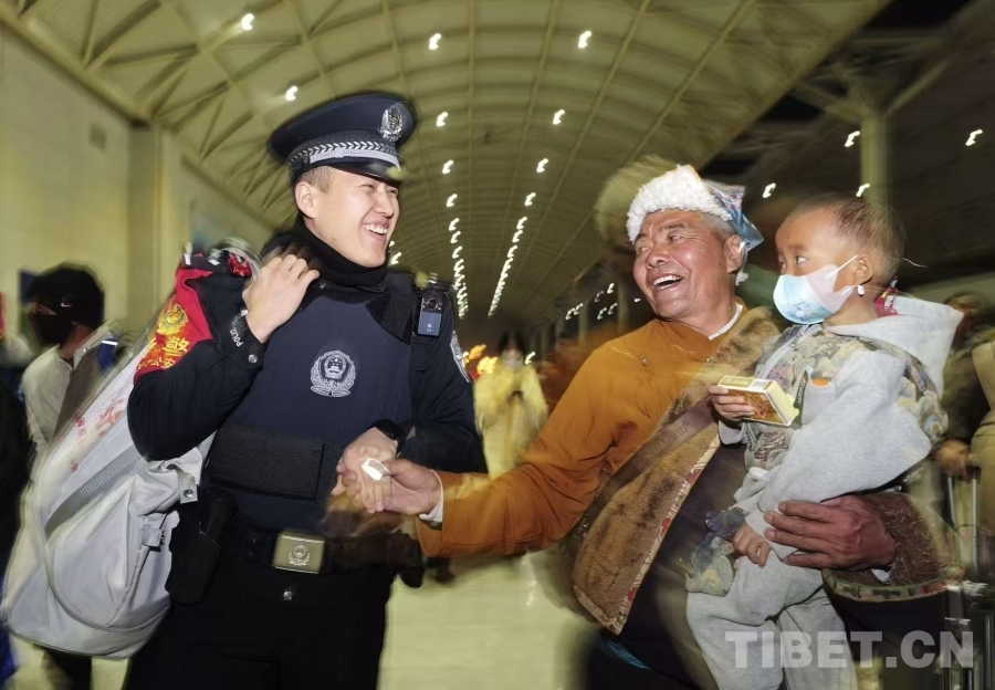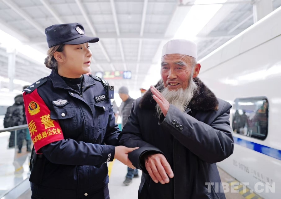 圖為西寧鐵路公安處乘警暖心幫扶返鄉(xiāng)各族群眾,用點滴行動守護旅客平安回家路