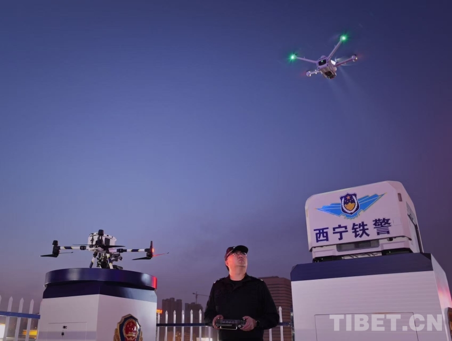 圖為西寧鐵警操作無人機開展空中巡防,用科技手段守護鐵路線路的安全穩(wěn)定
