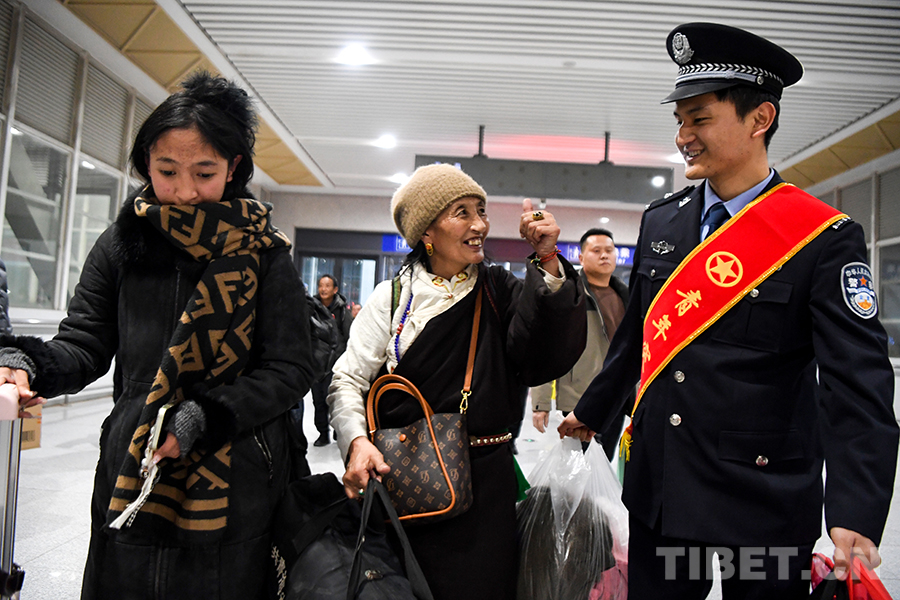 圖為身著藏藍(lán)、肩披紅綬帶的格爾木鐵路公安民警幫助返鄉(xiāng)的藏族阿媽踏上春運(yùn)旅途