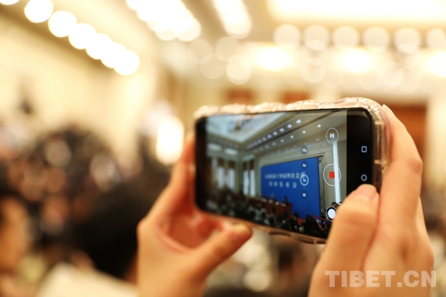3月3日下午,全國政協(xié)十四屆四次會議新聞發(fā)布會現(xiàn)場,記者們使用手機(jī)及時發(fā)布信息。攝影:劉莉