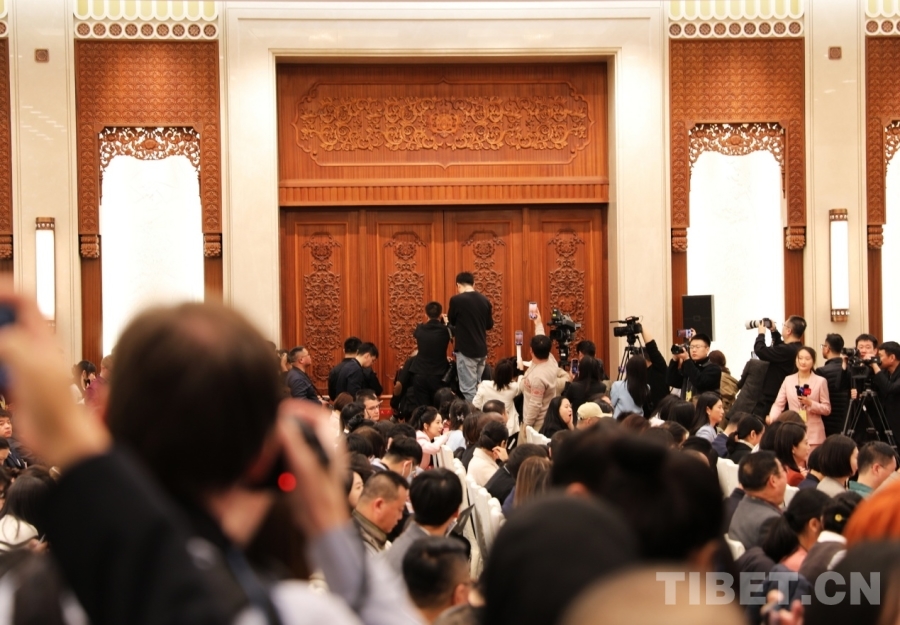 3月3日下午,全國政協(xié)十四屆四次會議新聞發(fā)布會開始前,記者們對準(zhǔn)大會新聞發(fā)言人劉結(jié)一即將進(jìn)入的新聞發(fā)布廳大門。攝影:劉莉