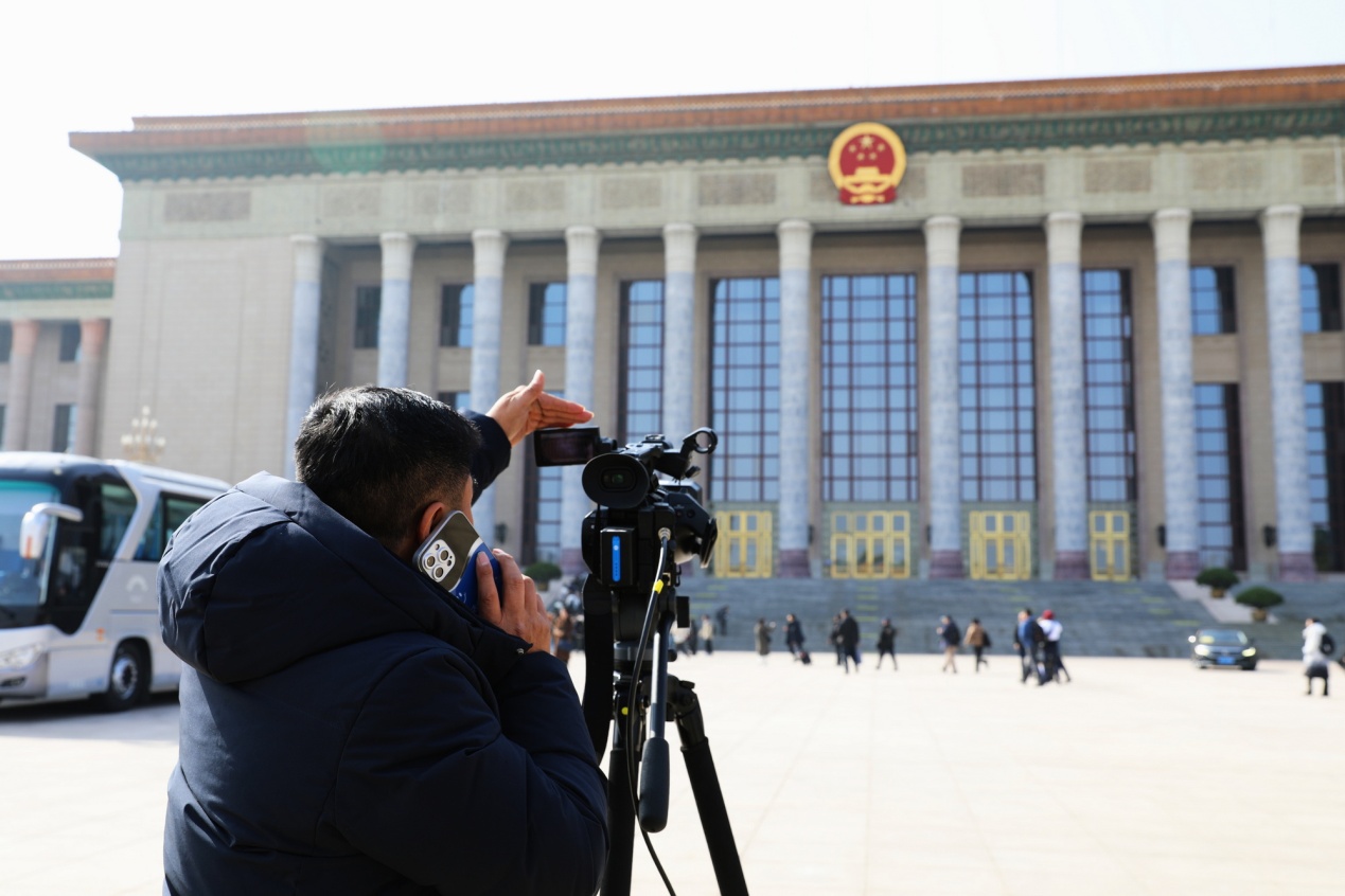 3月3日下午,本網(wǎng)記者在人民大會(huì)堂前,準(zhǔn)備參加全國(guó)政協(xié)十四屆四次會(huì)議新聞發(fā)布會(huì)。攝影:劉莉