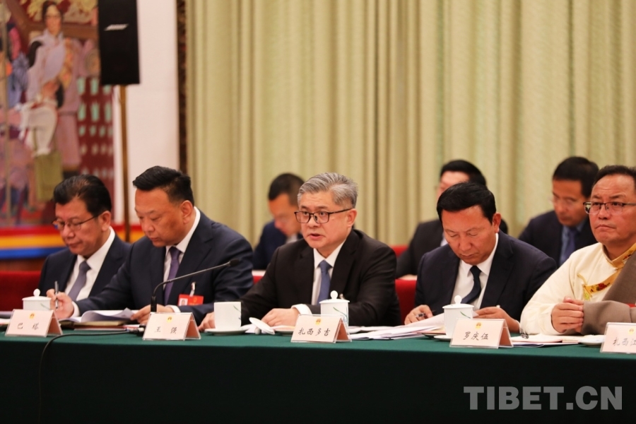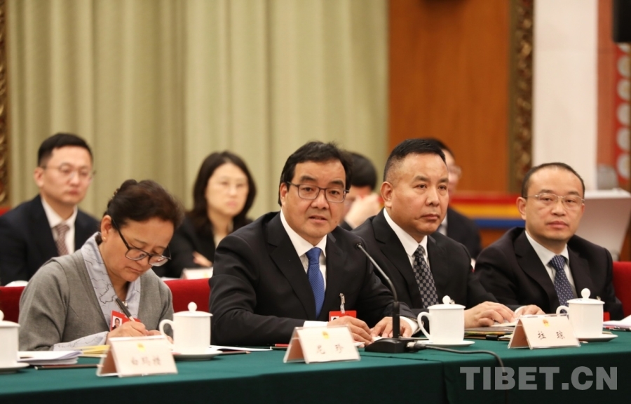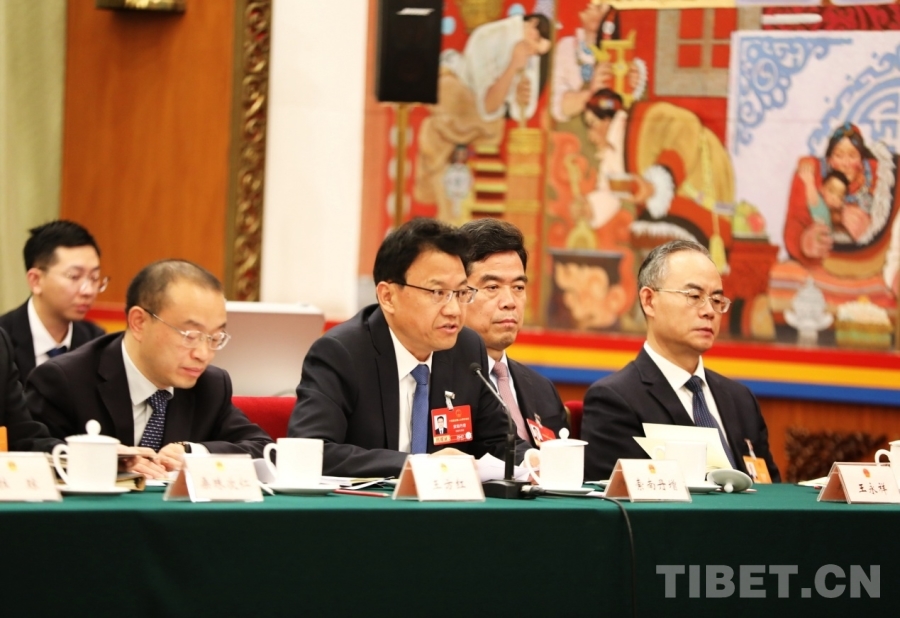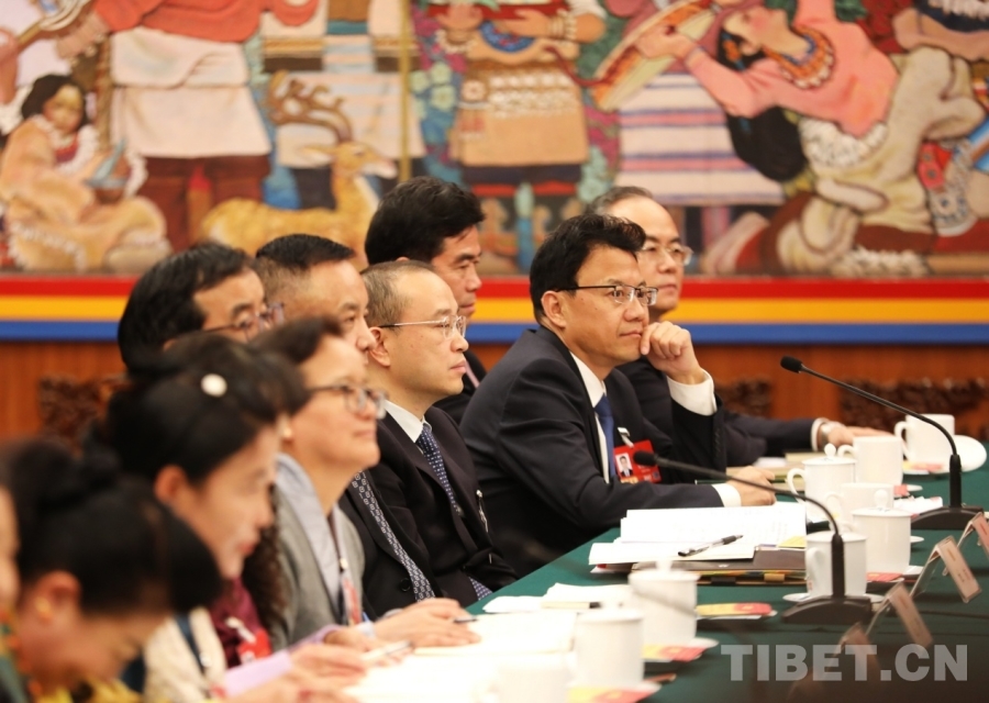 全國(guó)人大代表、西藏自治區(qū)林芝市委書(shū)記巴塔發(fā)言(右四)