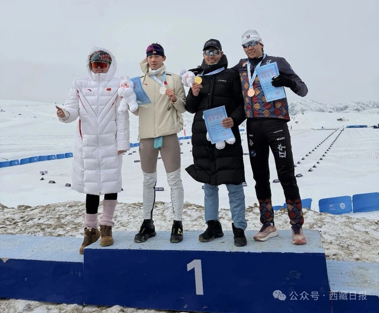 次仁占堆(右二)站在領(lǐng)獎(jiǎng)臺(tái)上