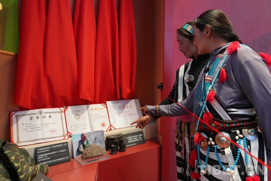 來自山南邊境的護(hù)邊員在民族文化宮看展時(shí)指著展品說:“我們在巡邊護(hù)邊途中也會(huì)在石頭上刻下祖國的名字。” 攝影:王茜