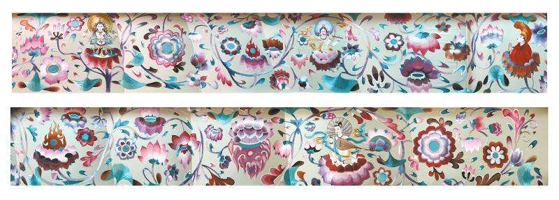 楊華珍的很多作品,是在傳統(tǒng)的基礎上再度創(chuàng)作。大牌頻頻青睞的《十二月花》,緣自她對羌族文化的打撈。“羌族文化中,有一種說法是每一個月份有一朵不同的花代表,比如2月是櫻花,3月是桃花?!睏钊A珍把12種花朵繡在一幅作品上?!段迨浠ā防铮?6朵花長在同一根藤蔓上,既是“56個民族、56支花”的生動演繹,更有“56個民族同氣連枝”的寓意?;ǘ涫菆F花,象征和睦團圓。而《蓮花化生圖》,靈感則來自于敦煌壁畫。在敦煌石窟里,楊華珍無意間看到了石窟頂部的蓮花和飛天,“蓮花在藏傳佛教中有修成正果的美好寓意”,她查閱了相關文獻和資料照片,再到唐卡中找尋內(nèi)容和故事填充。