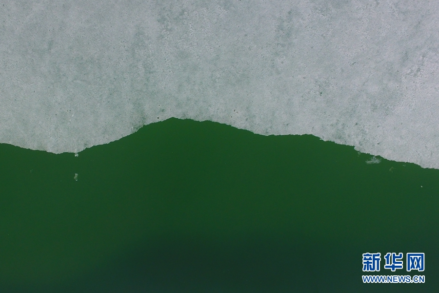 在風(fēng)力和氣溫的雙重作用下,湖面的冰層開(kāi)始破碎(4月17日攝)。新華網(wǎng) 潘彬彬 攝