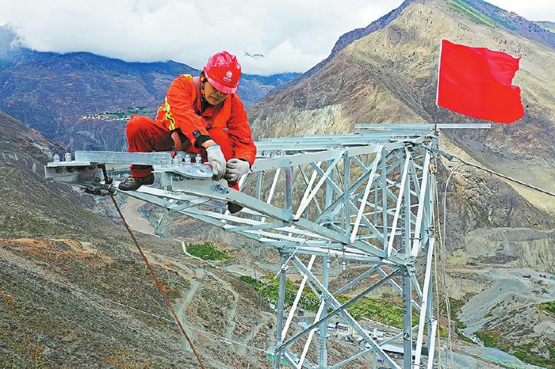 5月24日,甘孜州巴塘縣中咱-蘇洼龍35千伏線路工程78號(hào)塔放線現(xiàn)場,施工人員正在塔上進(jìn)行放線作業(yè)。