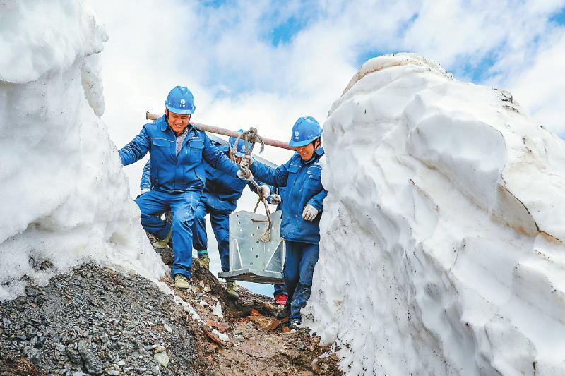 6月10日,阿壩州理縣夾壁—馬塘110千伏輸變電工程,建設(shè)者靠人力抬起沉重的塔材,艱難穿過高達(dá)2米的雪墻,前往組塔點(diǎn)位。