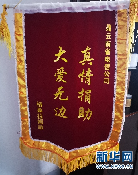 2019年9月,格桑拉姆將書(shū)有“真情捐助 大愛(ài)無(wú)邊”字樣的錦旗,送到前來(lái)燕門(mén)鄉(xiāng)調(diào)研的中國(guó)電信云南公司黨委書(shū)記、總經(jīng)理王宏手上,以表達(dá)自己的感激之情。