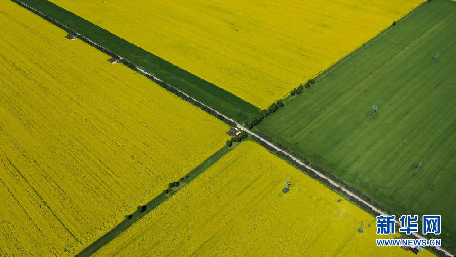 這是7月22日拍攝的門源回族自治縣境內(nèi)的油菜花田(無人機照片)。新華社記者 吳剛 攝