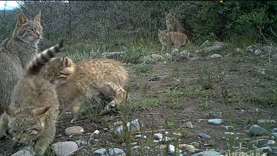 荒漠貓為中國所有貓科動(dòng)物中僅有的特有物種,《世界自然保護(hù)聯(lián)盟》(IUCN)瀕危(EN)物種,荒漠貓?jiān)谌珖鴶?shù)量稀少,分布密度低,對(duì)其生活史所知甚少。其通常棲息于海拔2500米至5000米干燥的高山與亞高山灌叢、戈壁、草甸生境中。自祁連山國家公園青海省管理局啟動(dòng)荒漠貓專項(xiàng)調(diào)查以來,在國家公園范圍內(nèi)頻繁記錄到荒漠貓活動(dòng)畫面,并且記錄到一只雌性荒漠貓成功撫育4只幼崽的畫面,監(jiān)測到5只荒漠貓同框的罕見畫面。祁連山國家公園青海片區(qū)自開展貓科動(dòng)物專項(xiàng)調(diào)查以來,記錄到5只雪豹同框、6只兔猻同框的罕見畫面后又一次記錄到貓科動(dòng)物多只同框的畫面。