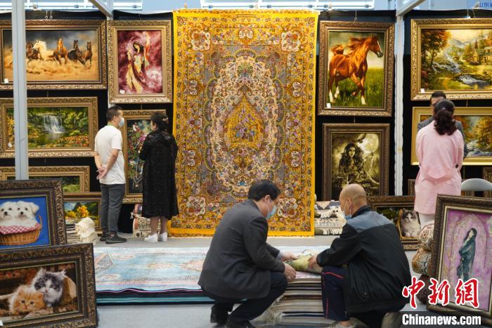 圖為伊朗參展商向客戶介紹地毯。文思睿 攝