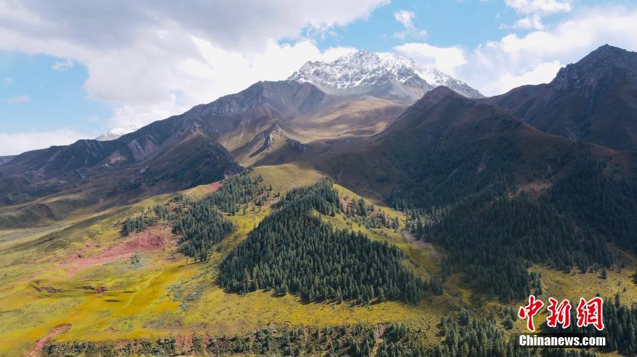 9月9日,航拍祁連山國家公園青海片區(qū)油葫蘆自然風景區(qū)美景。初秋時節(jié),祁連山國家公園青海片區(qū)草地漸黃,天高云淡,勾勒出一幅色彩斑斕的秋日美景圖。中新社記者 李江寧 攝