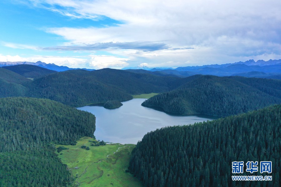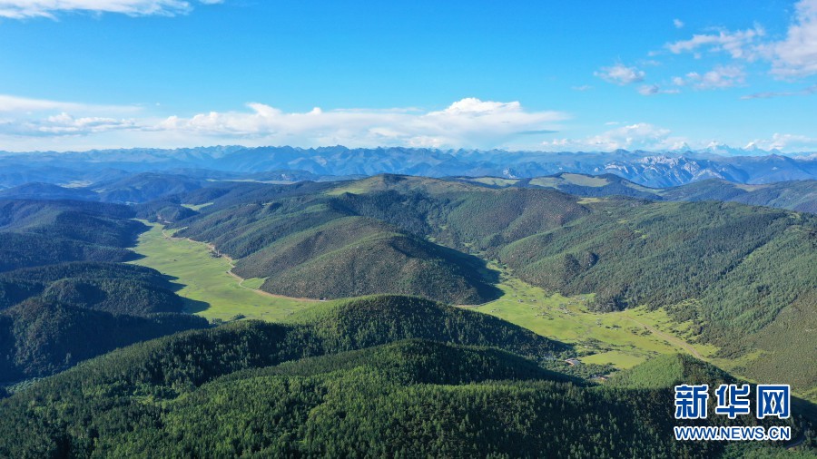 航拍視角下的普達(dá)措高山和草甸(攝于8月27日)。新華網(wǎng) 趙普凡 攝
