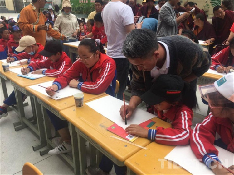 “右手拿筆,拇指和食指握住距離筆尖3厘米左右的位置,掌心中空書寫,對,就是這樣?!眮碜运拇ㄊ〔匚膶W(xué)校、西南民族大學(xué)、康巴文化研究院、甘孜日報社、甘孜民族中學(xué)、理塘?xí)覅f(xié)會等單位的14位書法家在縣城關(guān)小學(xué)為近100名小學(xué)生現(xiàn)場傳授和指導(dǎo)藏文書法書寫技巧和心得。