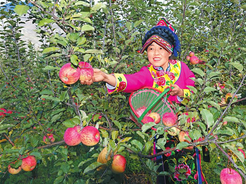 產(chǎn)業(yè)扶貧讓佳山村百姓過上了幸福生活。圖為佳山村村民正在摘蘋果。