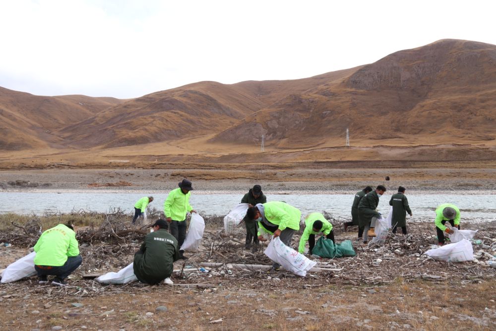 三江源國家公園治多生態(tài)環(huán)保協(xié)會的志愿者在清理河道內(nèi)的垃圾(7月11日攝)。新華社發(fā)