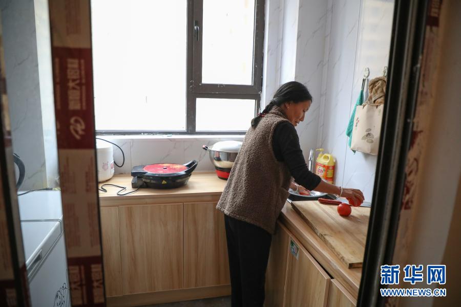 12月2日,在舟曲縣曲告納鎮(zhèn)田園生態(tài)小區(qū)易地扶貧搬遷集中安置點(diǎn),曲告納鎮(zhèn)茶坪村扎尕組村民在臨時(shí)安置的房屋內(nèi)做飯。新華社記者 馬希平 攝