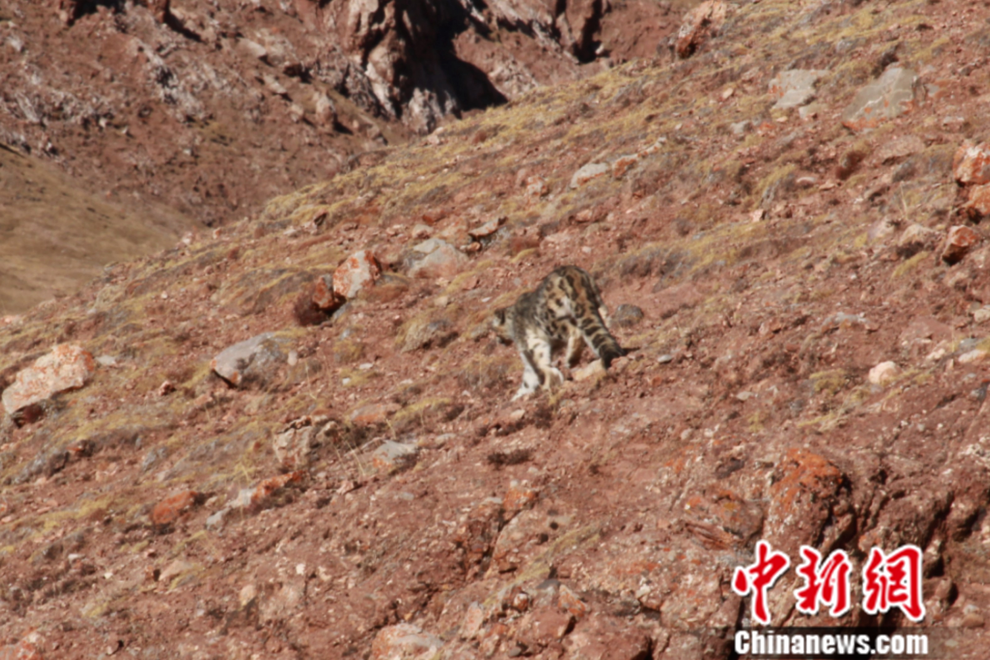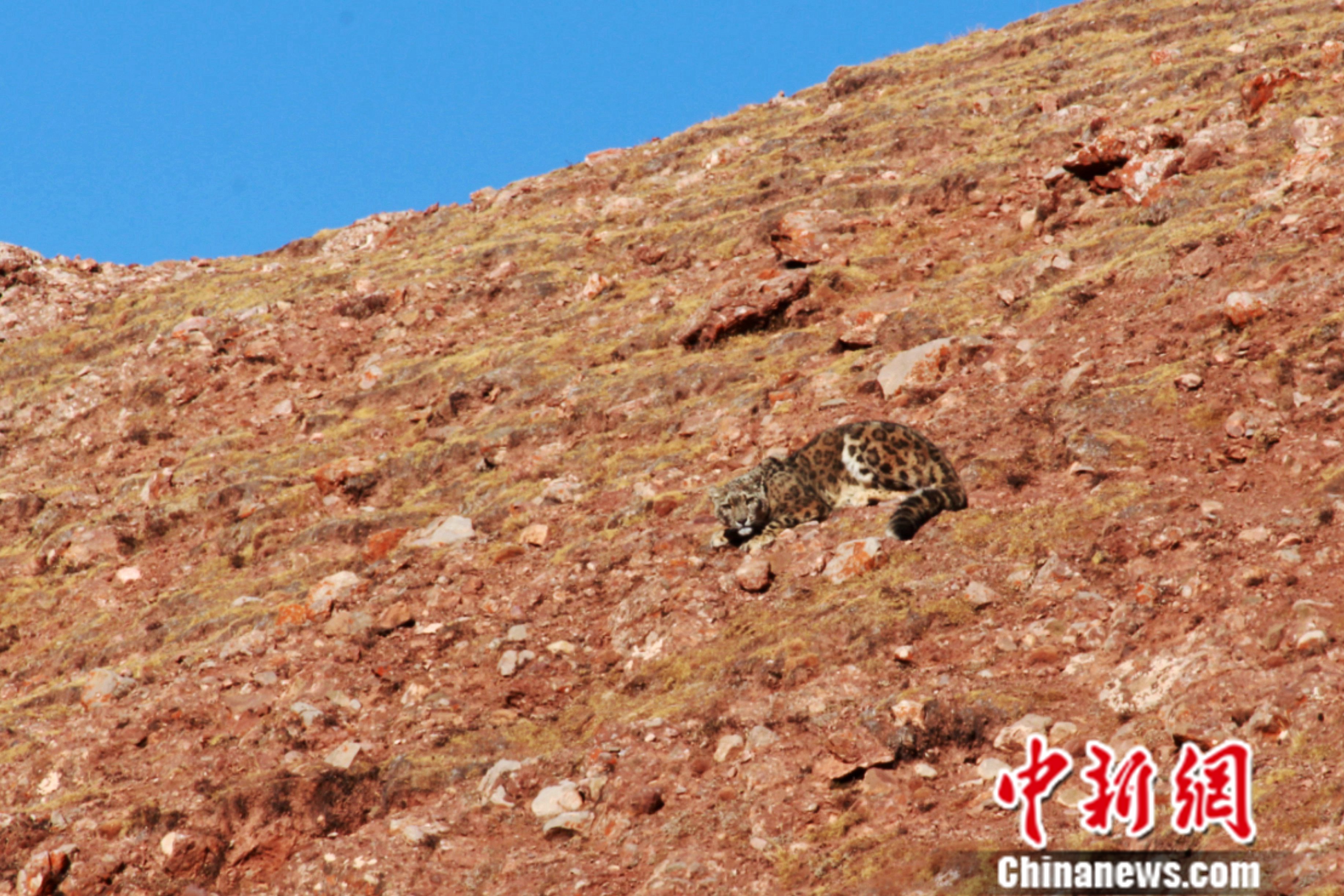 中新社記者看到,羅松扎西拍攝的動物臥在山坡上,酷似雪豹,但其皮毛顏色跟金錢豹接近,即呈現(xiàn)棕黃色,遍布斑點(diǎn)和環(huán)紋。