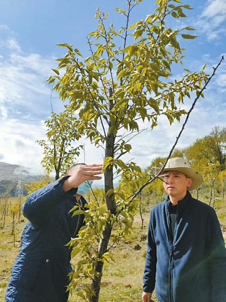 爐霍縣林草局技術(shù)人員檢查杏樹(shù)病蟲(chóng)害情況。(爐霍縣林草局供圖)