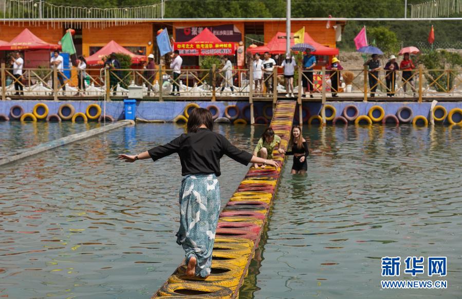 6月9日,游客在青海卓扎灘原生態(tài)景區(qū)的水上吊橋項目玩耍。新華社記者 吳剛 攝