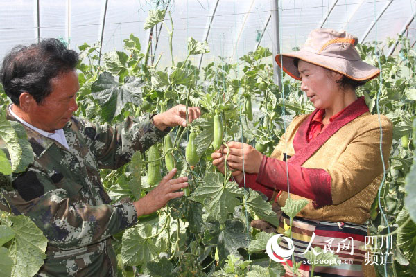“你們要把瓜葉分叉中長出的小瓜叉去掉,這樣就能減少瓜養(yǎng)分的消耗,長出的西瓜才能又大又甜?!币晃簧綎|漢子在蔬菜大棚里向當(dāng)?shù)氐霓r(nóng)牧民傳授種植西瓜的心得。2016年10月,理塘縣引進瑪吉阿米農(nóng)業(yè)開發(fā)有限公司,修建58個現(xiàn)代化標準大棚,并從山東引進了溫帶瓜果蔬菜的現(xiàn)代化種植技術(shù)。