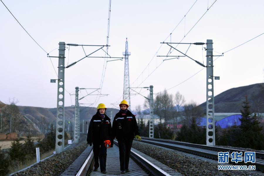 2月2日,在青藏鐵路公司西寧供電段哈爾蓋工區(qū)負(fù)責(zé)鐵路線上,郭勝強(左)與羅露露在巡檢接觸網(wǎng)。新華社記者 張龍 攝