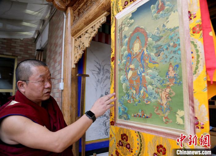 圖為印巴尖措展示唐卡作品。張?zhí)砀?攝