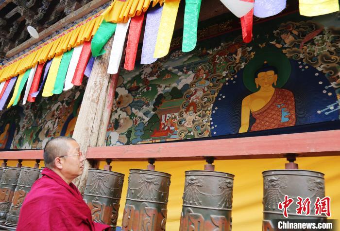 圖為印巴尖措為塔爾寺釋迦牟尼佛殿繪制的長30多米的大型壁畫《釋迦牟尼生平圖》。張?zhí)砀?攝