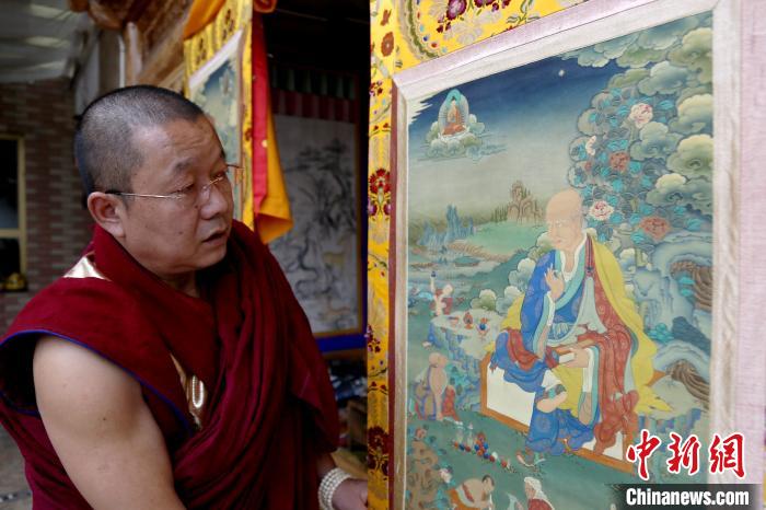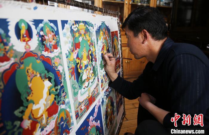 圖為印巴尖措畫唐卡。張?zhí)砀!z