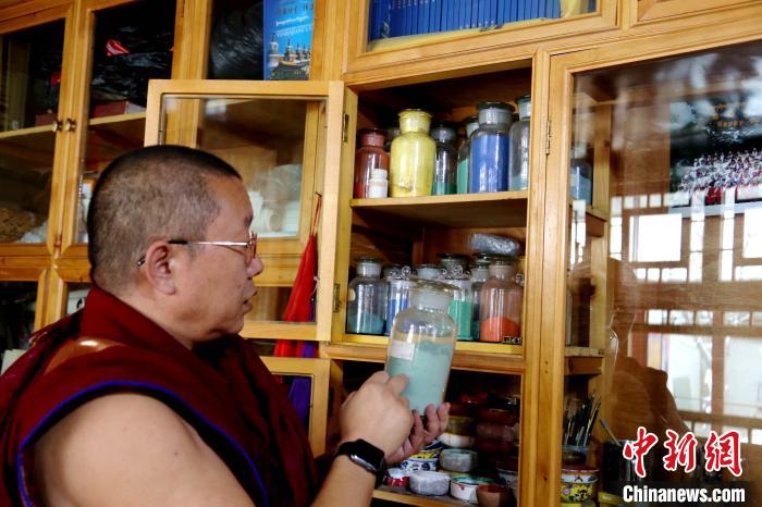 圖為印巴尖措展示唐卡、壁畫創(chuàng)作所需的礦物顏料。張?zhí)砀?攝