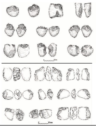 將塘達(dá)遺址石器(下圖)與井水灣遺址石制品比對(duì)發(fā)現(xiàn),塘達(dá)與井水灣遺址石器工業(yè)均就地取材,以遺址附近河灘礫石為主體原料,石核以雙面剝片和單面剝片模式為主,原料開(kāi)發(fā)利用強(qiáng)度適中,不見(jiàn)盤(pán)狀石核等更為復(fù)雜和具有預(yù)制性的石核剝片模式。石制品尺寸較大,工具類型中存在典型的刮削器和砍砸器,不見(jiàn)手斧和手鎬等大型切割工具,均屬于東亞典型石核—石片石器工業(yè)。
