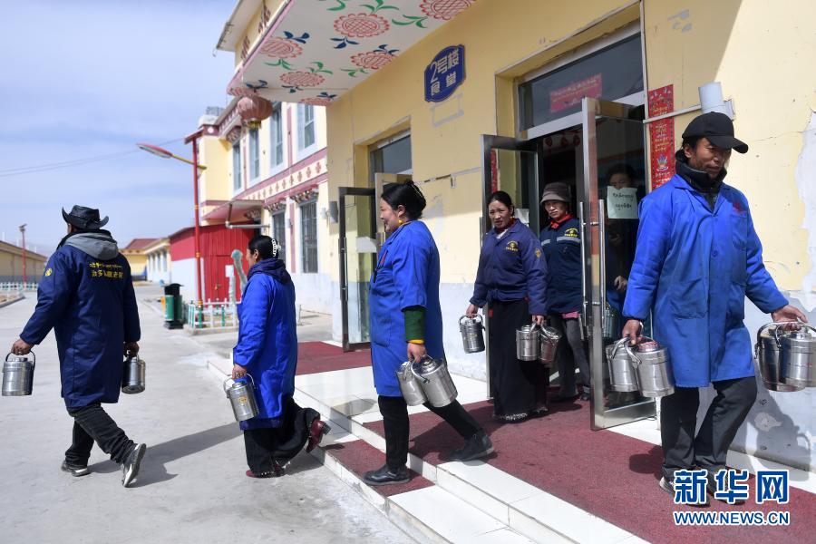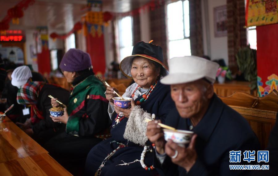 3月14日,在治多縣幸福敬老院食堂內(nèi),哈沙卡卓(右二)在吃午餐。新華社記者 張宏祥 攝