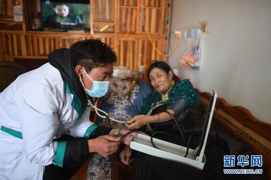 3月14日,幸福敬老院醫(yī)務(wù)室醫(yī)生土丁西周(左)為老人測(cè)量血壓。新華社記者 張宏祥 攝