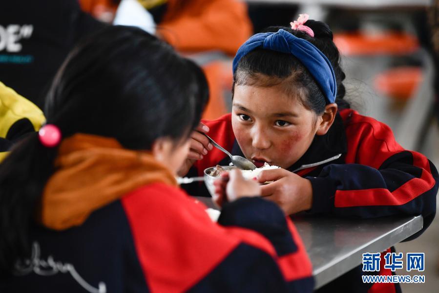 3月17日,在果洛藏族自治州甘德縣崗龍鄉(xiāng)寄宿制中心小學(xué),學(xué)生在食堂吃飯。新華社記者 張龍 攝
